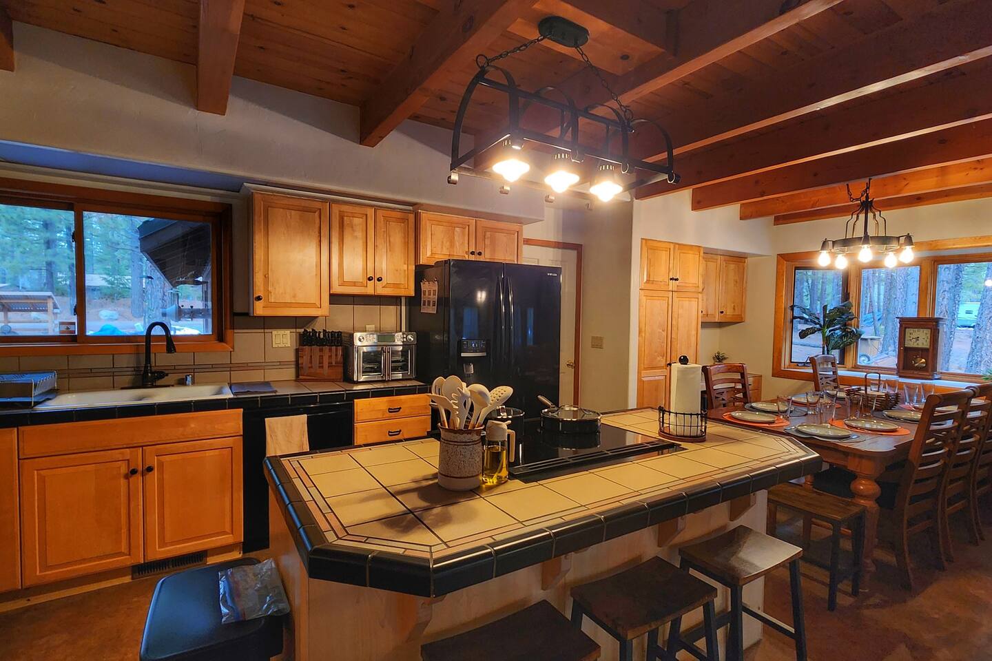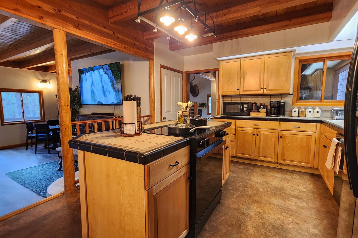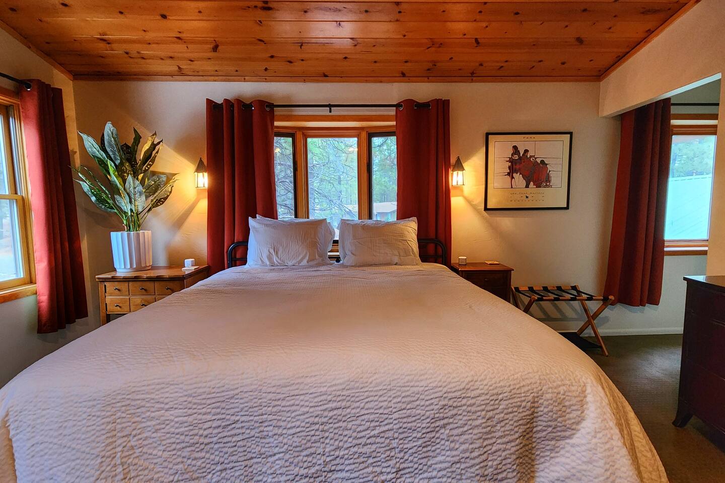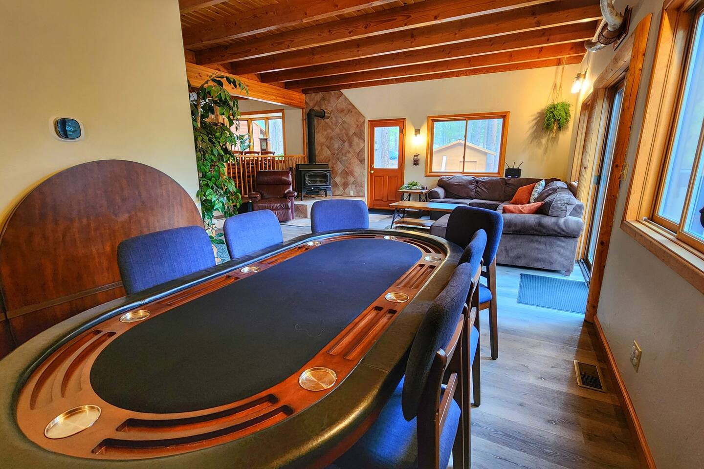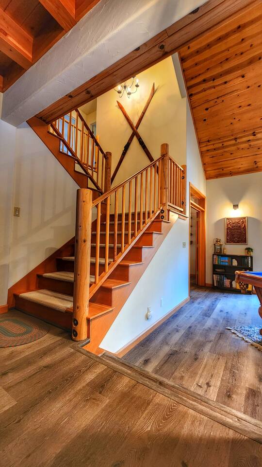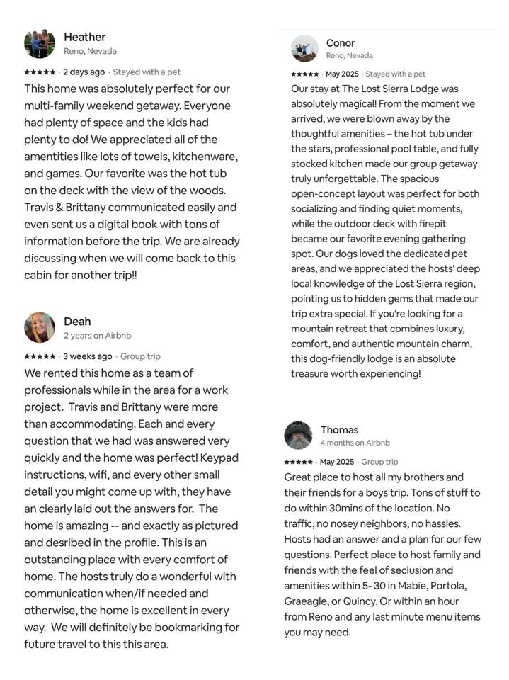 When you enter The Lost Sierra Lodge, the home opens up around you, revealing warm gathering spaces, natural light, and room for everyone to settle in. Some guests gravitate to the pool hall, others to the great room or deck, but the entire lodge is designed to make it easy for groups to relax, connect, and enjoy their time in the mountains. GREAT ROOM: KITCHEN, DINING, AND LIVING A spacious open layout brings everyone together. Relax on the sectional and enjoy the 75 inch smart TV with guest mode, or curl up by the wood stove. Multiple charging stations with USB A, USB C, and outlets are positioned throughout the room for convenience. A guitar sits ready for guests who want to play, and a piano restoration is currently in progress. POOL HALL A dedicated entertainment space with an 8 foot pool table, bar seating, and a comfortable lounge area. A Bluetooth soundbar sets the atmosphere, and French doors open directly to the deck and gas fire pit, creating an easy indoor and outdoor flow for group hangouts. GAME ROOM A professional 8 person poker table, complete with chips and cards, offers long evenings of friendly competition. The convertible top functions as a puzzle and game table and can also serve as additional dining space when the group needs it. FULLY STOCKED KITCHEN AND DINING Fully stocked for group cooking, the kitchen is equipped for preparing meals for groups of up to ten, with attention to both quality and detail. You’ll find formal and disposable dinnerware with complete sets for ten, including plates, bowls, wine glasses, tumblers, flatware, and steak knives. Cooking equipment includes a 14 piece ceramic pots and pans set, cutting boards, baking trays, muffin tins, a knife block with sharpener, measuring cups, mixing bowls, and a wide range of utensils. Small appliances include: • KitchenAid mixer • Blender • Rice maker • Popcorn machine (bring kernels) • Crockpots • Air fryer and toaster oven combo The pantry is stocked with over twenty spices, seasoning blends, BBQ rub, flour, sugars, pancake mix, and maple syrup to make cooking easy without multiple store runs. A dedicated coffee and tea station includes a standard pot and a K-Cup machine, with complimentary coffee grounds, pods, decaf options, an electric kettle, and Earl Grey and green teas. A built in desk with USB charging is integrated into the cabinetry, and the Wi-Fi router is placed in the living room for strong, reliable coverage. WRAP AROUND DECK AND BACKYARD The expansive deck offers a relaxing outdoor setting with a 7 person hot tub (please bring your own pool towels), outdoor dining for ten, a BBQ grill, and a gas fire pit. In the backyard, two disc golf baskets provide a fun activity between meals or outings. BEDROOMS Every bedroom includes freshly replaced hospitality grade linens, four pillows per bed (two firm and two soft), room darkening curtains, full length mirrors, luggage racks, and nightstands with USB A, USB C, and standard outlets. Each room offers ample storage through closets, drawers, or dressers. All upstairs bedrooms include ceiling fans for added airflow. Bedroom 1 (Downstairs) King bed, two luggage racks, under bed wheeled drawers, coat rack. Bedroom 2 (Loft Primary) King bed, en suite bathroom, wedding dress hook , sitting area, walk-in closet with shelving and hangers, emergency fire ladder, heaters, additional fans, and supplies for children and dogs. Bedrooms 3 and 4 Queen beds, closets with shelving and hangers, ceiling fans. Each includes an additional twin air mattress. Bedroom 5 Full bed and dresser with ceiling fan. BATHROOMS Each bathroom is stocked with dual rainfall showerheads, fresh towels, soap, shampoo, conditioner, body wash, and makeup cloths. Hairdryers and charging stations (USB A, USB C, outlets) are provided in each bathroom, along with excellent lighting ideal for getting ready for weddings, events, or nights out. Bathroom 1 (Downstairs Full Bath) Shower and tub combo with attached laundry room. Bathroom 2 (Primary En Suite) Standing shower, separate jetted tub, and a wide vanity mirror. Bathroom 3 (Upstairs Full Bath) Large shower and tub combo with an extended mirror. INFANTS We provide outlet covers, a high chair, and a pack n play. Please bring your own baby bedding. Our Story and Local Connections This home is more than a rental. Built by my parents in the late 1980s, it remains a family property that we care for deeply. Renting it seasonally helps us preserve a place that has been part of our family for generations. Our roots in the Lost Sierra date back to the 1800s, and we have deep connections throughout the community. We love sharing the best of Portola and Graeagle, from local food and breweries to hiking trails, scenic parks, golf courses, and optional in-home services such as yoga, bartending, and catering. To make planning easy, we provide a digital guidebook with all our favorite recommendations as soon as you book, which may be the most detailed and thoughtfully curated guide to Portola and Graeagle in the area.