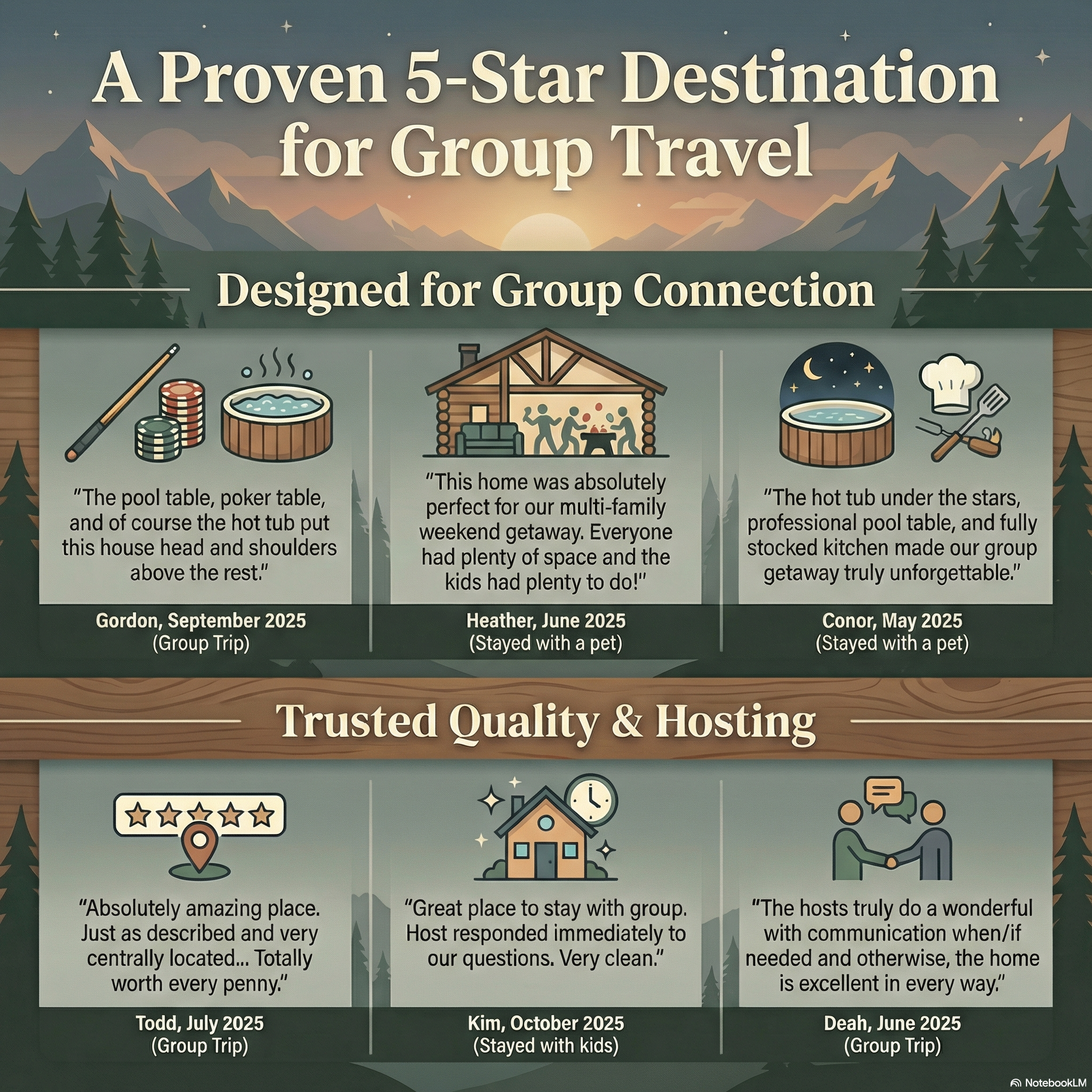 A Mountain Basecamp Built for Group Travel When you arrive at The Lost Sierra Lodge, the home opens up with warm gathering spaces, natural light, and room for everyone to spread out comfortably. The layout was intentionally designed for groups — making it easy to spend time together while still offering multiple places to relax, play, or step outside. Some guests gravitate toward the pool hall, others to the great room or deck, but the Lodge flows naturally between spaces so no one ever feels crowded. This is a home designed to host ten people comfortably, not squeeze them in. Our family has deep roots in the Lost Sierra dating back to the late 1800s, and we take pride in sharing a place that has been thoughtfully cared for and intentionally set up for guests. We’re always happy to help you experience the area like a local. Great Room: Kitchen, Dining & Living The great room is where most groups naturally come together — for shared meals, movie nights, or winding down after a day out. The open-concept layout connects the kitchen, dining, and living areas, creating a true central hub for the home. Here you’ll find: — Spacious open-concept kitchen, dining, and living space — Comfortable seating and a 75-inch Smart TV with guest mode — Wood stove for cozy evenings — Charging stations throughout (USB-A, USB-C, and standard outlets) — A guitar available for guests who play (piano restoration in progress) Pool Hall & Game Room The pool hall is a favorite spot for relaxed evenings and easy group hangouts. It features an 8-foot pool table, bar seating, and a comfortable lounge area. A Bluetooth soundbar sets the atmosphere, and French doors open directly to the deck and gas fire pit, creating a seamless indoor-outdoor flow. Just beyond, the game room often becomes the center of late-night competition and conversation. A professional 8-person poker table anchors the space and includes chips and cards. The convertible top doubles as a puzzle or game table and can also serve as extra dining space when needed. Fully Stocked Kitchen & Dining This kitchen was built for real group cooking — not just reheating leftovers. It’s fully equipped to prepare meals for up to ten guests and stocked with everything needed to cook, serve, and enjoy meals together. You’ll have access to: — Complete place settings for ten, including plates, bowls, wine glasses, tumblers, flatware, and steak knives — Ceramic cookware and a knife block with sharpener — Cutting boards, baking trays, muffin tins — Mixing bowls, measuring cups, and a full utensil selection For appliances, the kitchen includes: — KitchenAid stand mixer — Blender and rice cooker — Crockpots — Air fryer / toaster oven combo — Popcorn machine The pantry is stocked with over 20 spices and staples, including BBQ rubs, flour, sugars, pancake mix, and maple syrup to keep cooking simple and minimize store runs. A dedicated coffee and tea station includes a drip coffee maker, a K-Cup machine, complimentary coffee and pods (including decaf), an electric kettle, and a selection of Earl Grey and green teas. A built-in desk with USB charging is integrated into the cabinetry, and the Wi-Fi router is centrally located for strong, reliable coverage throughout the home. Outdoor Living: Deck, Fire Pit & Hot Tub Outside, the expansive wraparound deck feels like an extension of the living space and is a favorite gathering spot throughout the year. Outdoors you’ll find: — Dining for ten — BBQ grill — Gas fire pit — 7-person hot tub under dark Sierra skies In the backyard, two disc golf baskets offer a casual way to stretch your legs between meals or outings. Bedrooms & Comfort Each bedroom is designed for real group travel — comfortable, quiet, and easy to settle into for multi-night stays. Every room includes: — Fresh hospitality-grade linens — Four pillows per bed (two firm, two soft) — Room-darkening curtains — Full-length mirrors — Luggage racks and ample storage — Nightstands with USB-A, USB-C, and standard outlets — Ceiling fans in all upstairs bedrooms The downstairs bedroom features a king bed with easy access to shared spaces. The lofted primary suite above the pool hall offers space, light, and an en-suite bathroom, along with a sitting area and thoughtful extras for wedding parties and families. Bedrooms three and four include queen beds with additional twin air mattresses, while the fifth bedroom offers a full bed — giving groups flexible sleeping options without sacrificing comfort. Why Book Direct We designed our direct booking experience to be simple, transparent, and guest-focused. When you book directly through our website, you receive: — A 15% savings compared to Airbnb — Clear pricing with no platform service fees — Direct communication with us as your hosts — Priority support before and during your stay — The same professional hosting experience, just with more value Booking direct allows us to invest more into the home, the guest experience, and the level of care that keeps the Lodge special. Location & What Brings Guests Here The Lost Sierra is a destination known for wide-open spaces, small-town charm, and easy access to outdoor adventure. The Lodge is centrally located between Portola and Graeagle, putting you close to some of the best experiences in the region. Guests come here for: — Championship-caliber golf courses — Iconic wedding venues and scenic celebrations — Hiking, fishing, and outdoor recreation — Local breweries and restaurants — Quiet mountain towns and uncrowded trails After booking, you’ll receive access to our in-house digital guidebook, packed with curated recommendations to help you plan your stay and experience the Lost Sierra like a local. A Final Note on Hosting We encourage guests to reach out anytime before, during, or after their stay with questions, needs, or local recommendations. We’d always rather hear from you than have you wonder